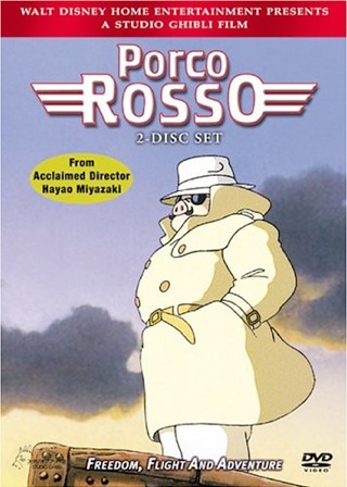 "Porco Rosso" ("The Crimson Pig", 1992) ranks as Hayao Miyazaki's oddest film: a bittersweet period adventure about a dashing pilot who has somehow been turned into a pig. Miyazaki once said, "Initially, it was supposed to be a 45-minute film for tired businessmen to watch on long airplane flights... Why kids love it is a mystery to me." The early 1930s setting enabled Miyazaki to focus on the old airplanes he loves, and the film boasts complex and extremely effective aerial stunts and dogfights. In the new English dub from Disney, Michael Keaton as Porco delivers lines like "All middle-aged men are pigs" with appropriate cynicism, but his voice may be too familiar for some Miyazaki fans. Susan Egan makes a curiously distant Gina, the thrice-widowed hotel owner bound to Porco by years of friendship; Kimberly Williams is more effective as the irrepressible young engineer Fio. "Porco Rosso" may be an odd film, but Miyazaki's directorial imagination never flags. (Rated PG: violence, alcohol and tobacco use) "--Charles Solomon"